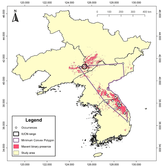 Here, we address the extinction threats to Scincella huanrenensis, a species described in the People’s Republic of China, but also occurring on the Korean peninsula. Estimating the threats to the species is not an easy task due to its unknown population status in the Democratic People’s Republic of Korea. Here we analysed the literature to acquire the known presence point for the species, along with datapoints originating from opportunistic field surveys, and employed habitat suitability models to estimate the range of the species.