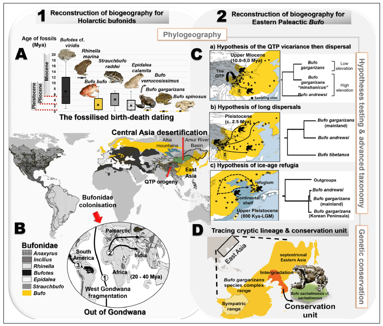 동부 구북구에 있는 두꺼비과(Bufo 속)는 지리적으로 광범위하게 분포하고 있기 때문에, 그 다양성을 알기 어렵고 종의 기원 또한 불확실하며, 분류학적인 경계도 불분명하다. 우리는 아시아 두꺼비과의 역사적 생물 지리를 재구성하고, 동아시아의 B. gargarizans의 사례 등에서 찾아볼 수 있는 종 복합체 분류 문제를 해결하기 위해 B. gargarizans 복합체의 전 지리적 범위에서 433 개체를 샘플링했다.