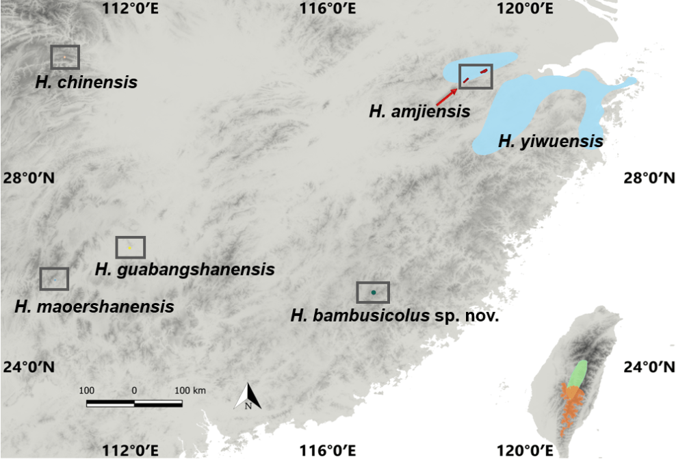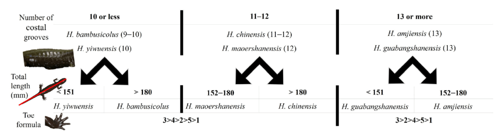 We described H. bambusicolus based on divergent genetic origins, unique morphological characteristics, and separate distribution from other Hynobius species. Identification of H. bambusicolus is easiest based on its geographic location, as it has no overlap with other Hynobius species and is an ancient lineage that likely experienced distribution changes due to paleogeographic and climatic variations. The area inhabited by this species also includes other Caudata, and competition with other genera may occur.
