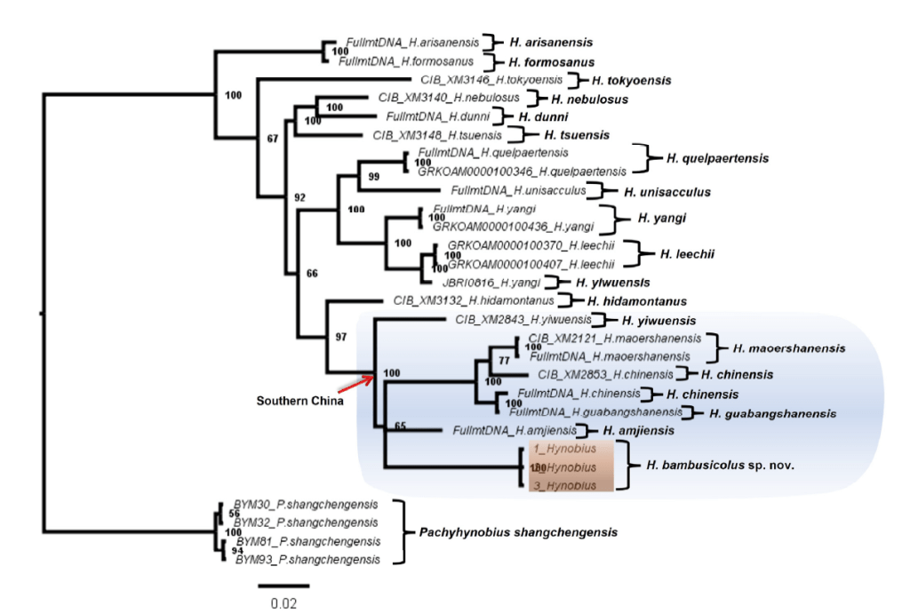 Most Hynobius salamander species in China are expected to have been described, but taxonomic resolutions are ongoing. There are six described species on the Chinese mainland and five on Taiwan island, all terrestrial, partially fossorial and breeding through larval development in water bodies. A Hynobius salamander collected in 1978 from Fujian has not been seen since, potentially because of local extirpations. We tested for phylogenetic clustering within the H. chinensis clade and determined the taxonomic status with phylogenetic tools, resulting in the description of a new species, Hynobius bambusicolus.