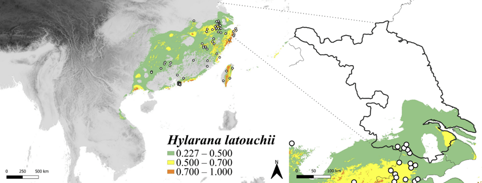 The models indicated that, at least from a purely climatic standpoint, there is more viable habitat for all four frog species within Jiangsu, so perhaps in the future they’ll be found even further north than we found them. The model for the viper species didn’t show suitable habitat within Jiangsu, but as the climate warms this subtropical species may work its way further north anyway. To view the maps for the other four species or read more details, the full paper is free to read at https://doi.org/10.3897/herpetozoa.37.e117370.