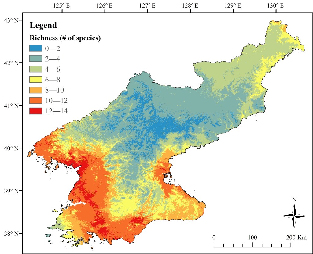 Amphibian species richness for all amphibian species recorded in DPR Korea. This map combines MaxEnt models using a sum of presence probabilities. See full text for details.