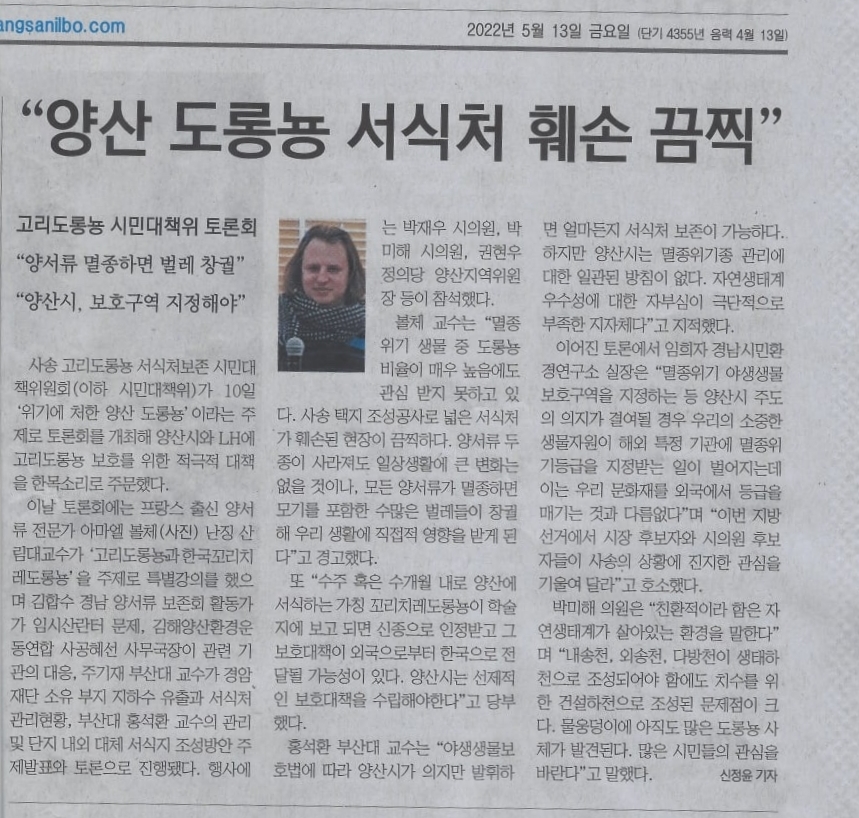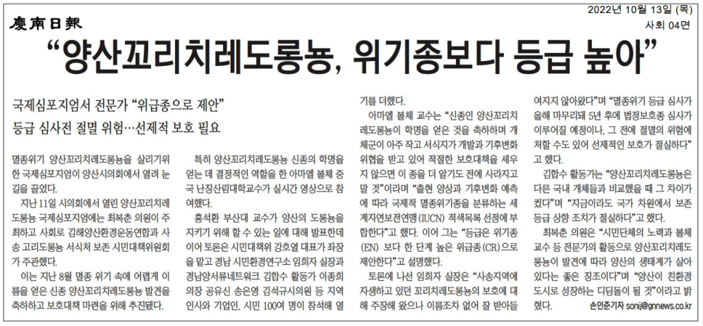 May 2022. The outcome of the workshop on the conservation of salamanders in Yangsan was followed up online by Ilsan Ilbo, StraightNews, OhMyNews and GN News, and in press by Yangsan Ilbo!