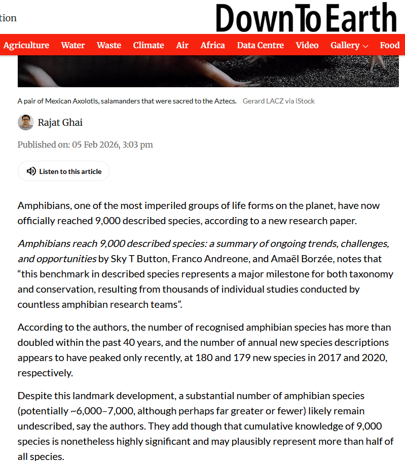 February 2026. Cover story by Down To Earth on the FrogLog article reporting the 9000th described species of amphibians.