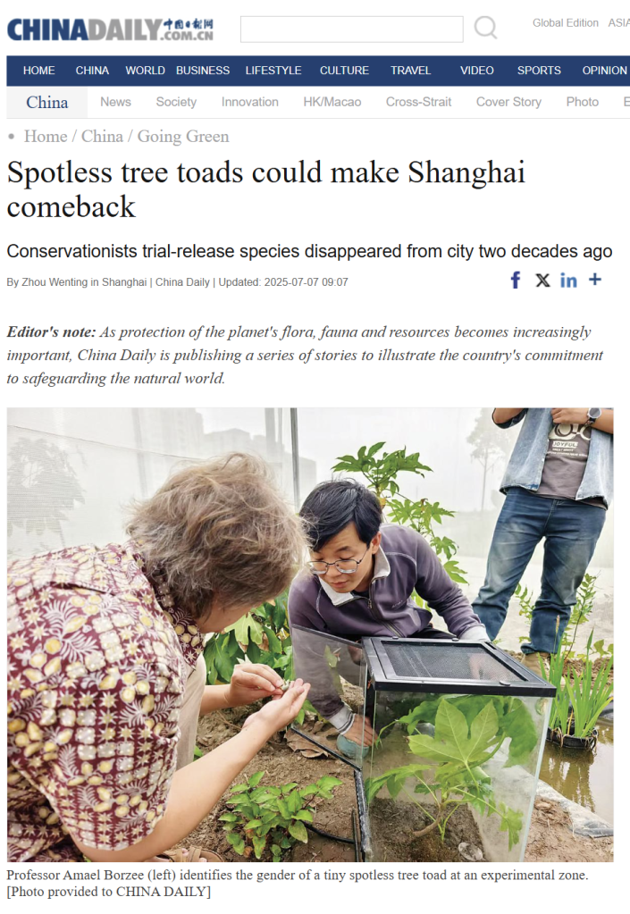 July 2025. Report in China Daily and Diario Del Pueblo Digital about the ex situ conservation project for the Immaculate Treefrog conducted with Forest Studio Shanghai.